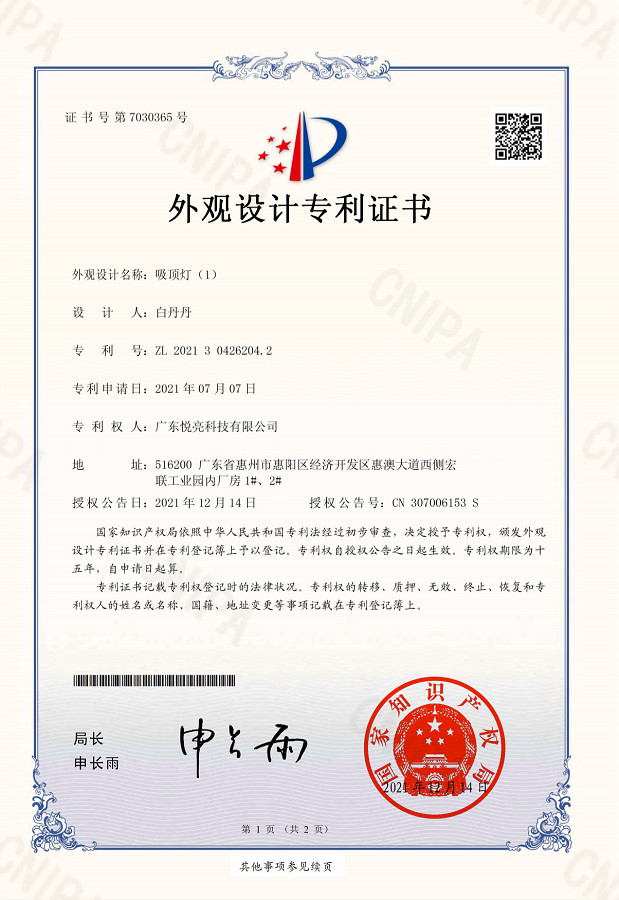廣東悅亮-簡(jiǎn)約款吸頂燈外觀設(shè)計(jì)專利證書