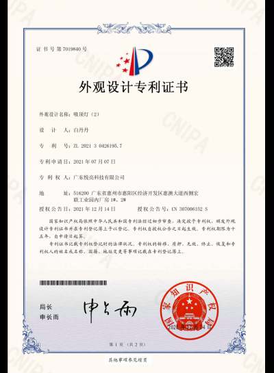 廣東悅亮-簡約款吸頂燈外觀設(shè)計專利證書