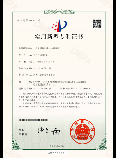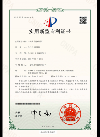 廣東悅亮-一種多功能吸頂燈-實用新型專利證書