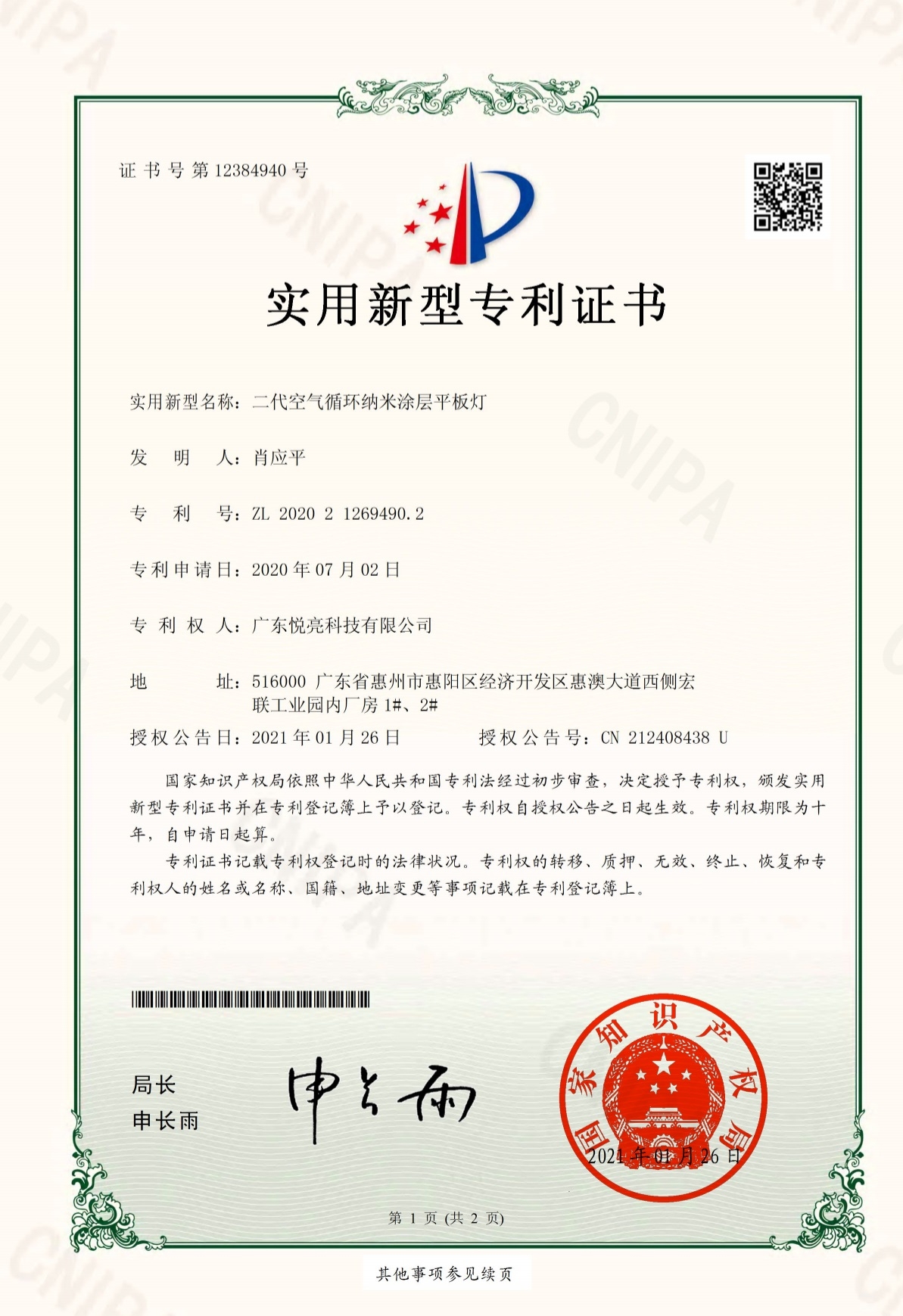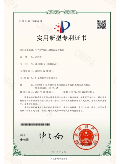 廣東悅亮空氣循環(huán)納米涂層平板燈_實(shí)用新型專利證書