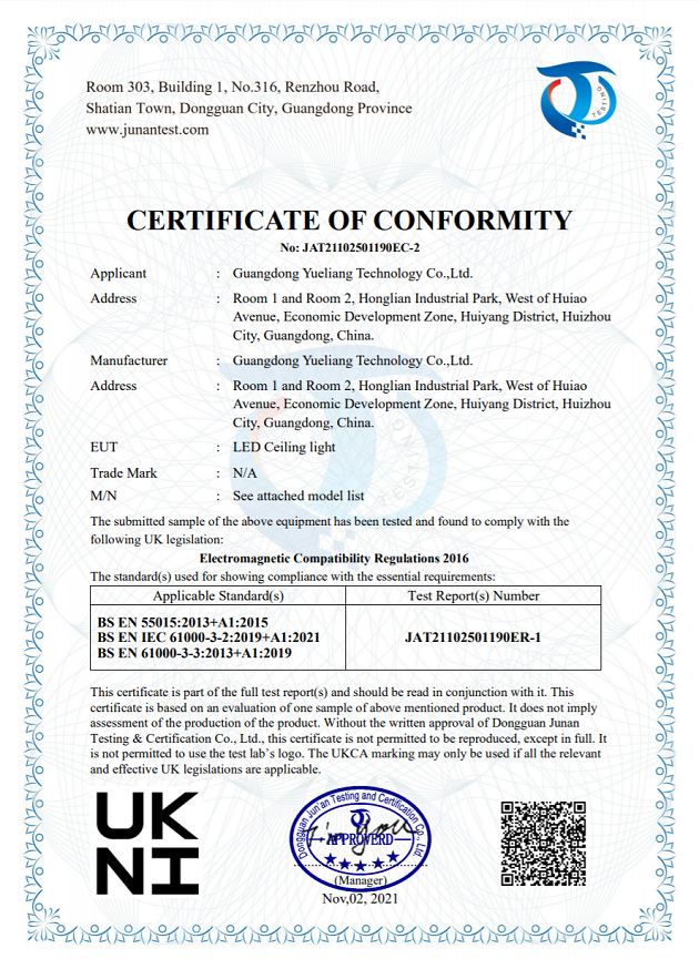 廣東悅亮-側(cè)發(fā)光吸頂燈UKCA-EMC證書